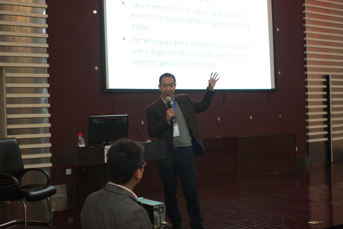 研讨会下午场包含两个特邀报告。第一个特邀报告由香港理工大学计算系郭嵩教授带来,特邀报告题为“Data Driven Resource Management in Collaborative Edge Computing”。郭教授讨论了如何应用边缘计算解决因地理位置导致的云服务延迟问题,并通过展示和分析实际采集的数据,揭示了有效分配计算节点和传输带宽等资源对于降低云服务时延的可行性。最后,郭教授还为参会老师和同学们带来了其团队基于时空关联地理分布大数据分析方面的一些最新研究成果。