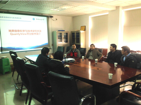 张冬梅向来宾详细介绍了我校“空间信息与数字技术”专业的申办过程、目标定位、目前的建设情况和未来的发展方向。她指出该专业旨在培养既懂计算机又懂地质的专业复合型创新人才,服务国家地质工作信息化和智慧城市建设工程。何珍文代表团队向两校代表详细介绍了应用系科研团队情况及主要的科研成果。
