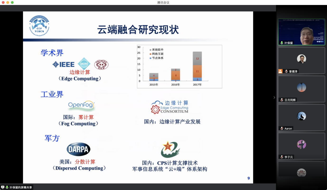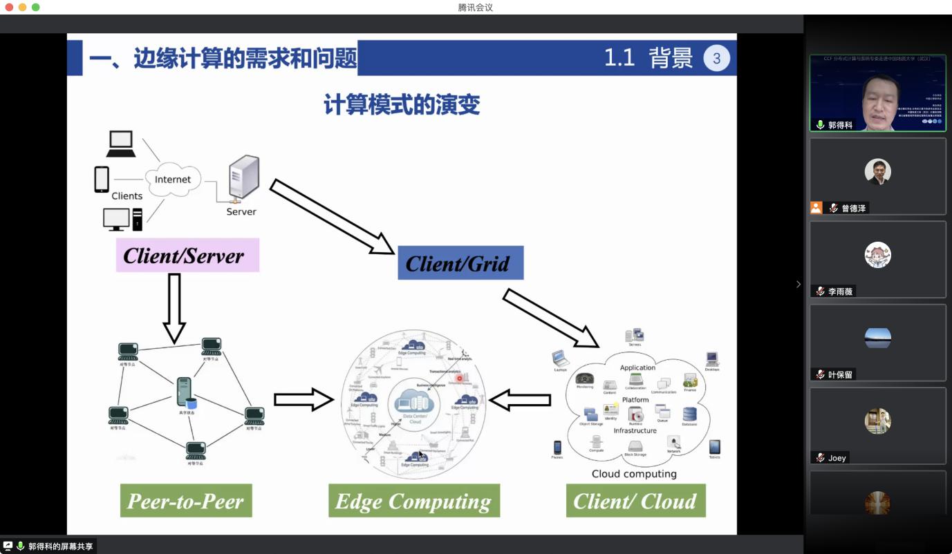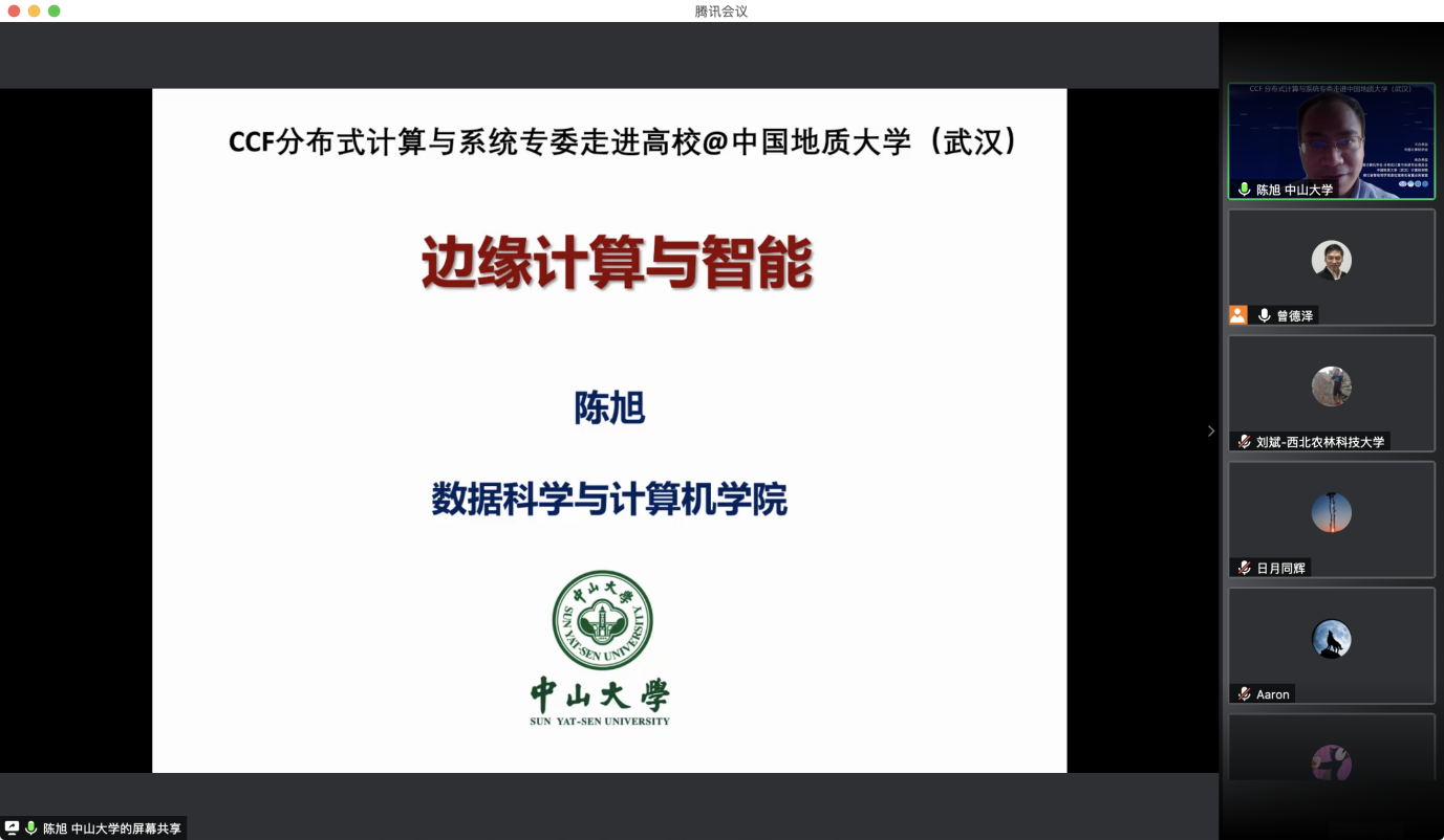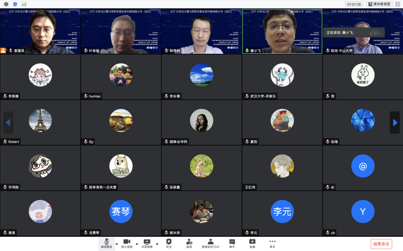 “CCF分布式计算与系统专委走进高校系列报告会”第1期——走进十大买球的正规网站于 2020 年7 月 25日在线成功举办。该活动由中国计算机学会主办,CCF会分布式计算与系统专业委员会、十大买球的正规网站、智能地学信息处理湖北省重点实验室承办。分布式计算与系统专委会委员国防科技大学郭得科教授、南京大学叶保留教授、中山大学陈旭教授应邀作学术报告,十大买球的正规网站曾德泽教授主持会议。会议采用线上腾讯会议和 B 站会议直播的方式,下午参加腾讯会议的人气峰值达175,观看直播的人气峰值达300余人,累计参会人数近500人。参会人员来自包括十大买球的正规网站、南京大学、中山大学、国防科技大学、华中科技大学、武汉大学、南开大学、武汉理工大学、中南财政政法大学、华中师范大学、武汉工程大学、湖北大学、西南大学、南京邮电大学、南京理工大学等多所高校。