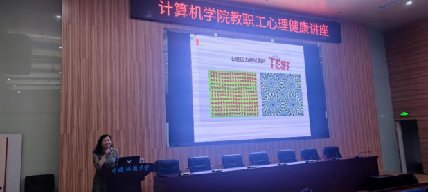 讲座的最后一部分,王煜介绍了教师如何进行自我心理保护。她指出,教师工作的压力主要来源于社会环境、学校、家长、学生以及自身五个方面。过大的压力会对个人身心产生负面影响,甚至产生职业倦怠。为了测试老师们的压力,王煜还展示了压力测试图片,老师们对此积极分享自己的观看感受。接着,王煜提供了自我心理保护的有效手段,介绍了以评估为中心、以问题为中心、以生理为中心和以情绪为中心的四类应对压力的方法。在本部分内容最后,王煜祝老师们在育人助人的同时每天都有好心情。