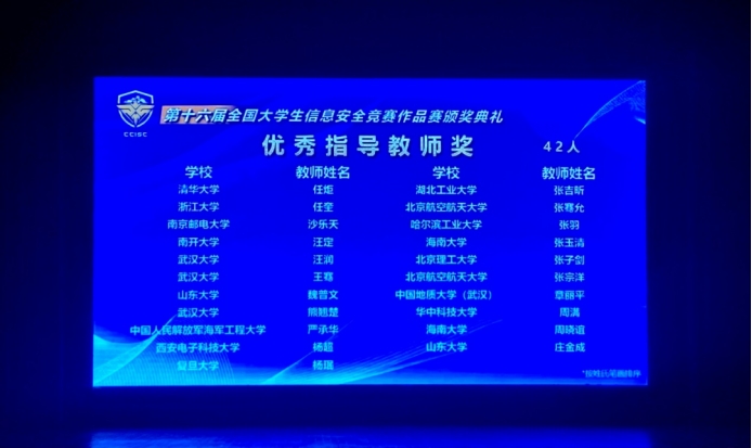 2023年8月17-20日,由教育部高等学校网络空间安全专业教学指导委员会主办,浙江大学、杭州电子科技大学承办的第十六届全国大学生信息安全竞赛作品赛决赛在浙江大学紫金港校区隆重举行。我校十大买球的正规网站四元一次方程组战队荣获“全国一等奖”,指导老师章丽平副教授荣获“优秀指导老师奖”!