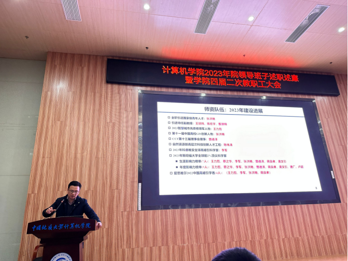 李国昌代表院领导班子作2023年述职报告。他表示,2023年,学院坚持党建引领,师生政治站位进一步提升,党的建设全面加强,全面从严治党深入推进,校友、工会、统战、群团和安全稳定等工作保障有力,学院办学水平进一步提升;学院坚持攻坚克难,“十四五”规划总体进展顺利,学科平台建设成效显著,师资队伍建设稳步推进,高水平人才培养机制不断完善,课程建设取得新成绩,学科竞赛生态不断优化,招生就业取得优异成绩,学院的思政教育成果不断涌现,科研能力大幅提升,学术交流合作与社会服务方式日益多元,内控机制逐步完善,学院实现高质量发展。同时他还指出学院领导将继续提升素质与能力,坚定不移推进学院2024年工作不断取得新的成绩。