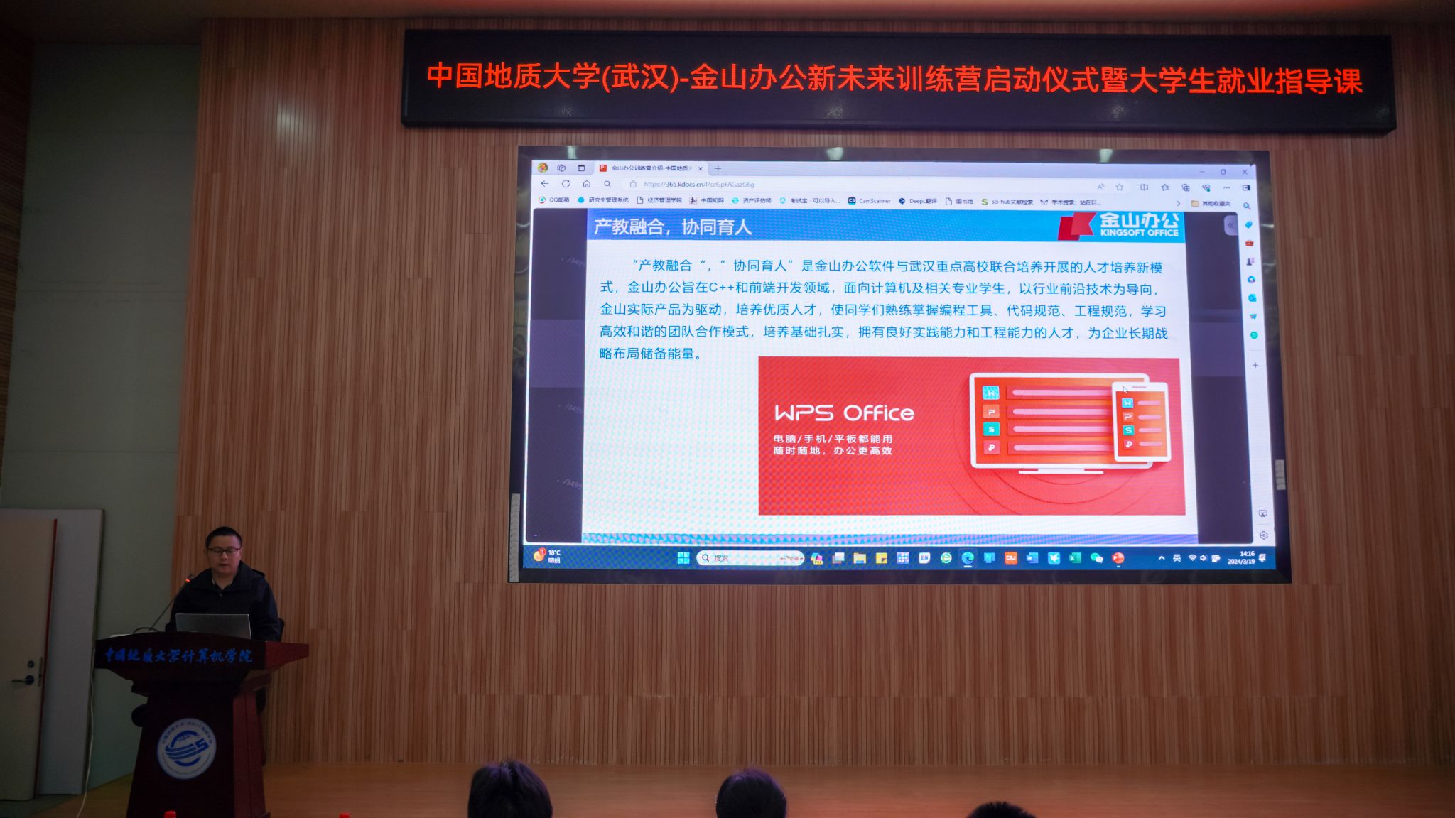 杨钢致辞。他表示金山办公非常注重技术和人才培养,致力于把互联网前沿技术带进高校。去年,两个单位联合申报的就业育人项目获教育部就业育人优秀案例,今年,我们也一如既往的提供高质量的学习资源和学习环境,将前沿的技术和真实的项目案例提供给同学们。期待和地大的合作更上一个台阶,