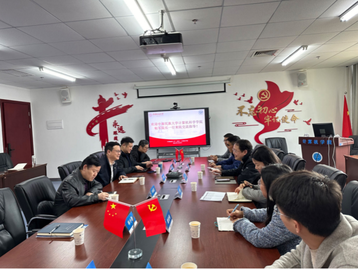 3月26日上午,中南民族大学计算机科学学院院长帖军、党委副书记王魏芳,携计算机科学与技术系主任徐胜舟、人工智能系主任康怡琳、软件工程系主任彭川、党建工作联络员沈易军等一行6人来十大买球官网交流。学院党委书记李国昌、院长张洪艳、党委副书记林小艳、副院长陈云亮、计算机科学与技术系主任熊慕舟、软件工程系主任李圣文、智能科学与技术系副主任姜三等同志参与交流研讨。张洪艳院长主持会议。