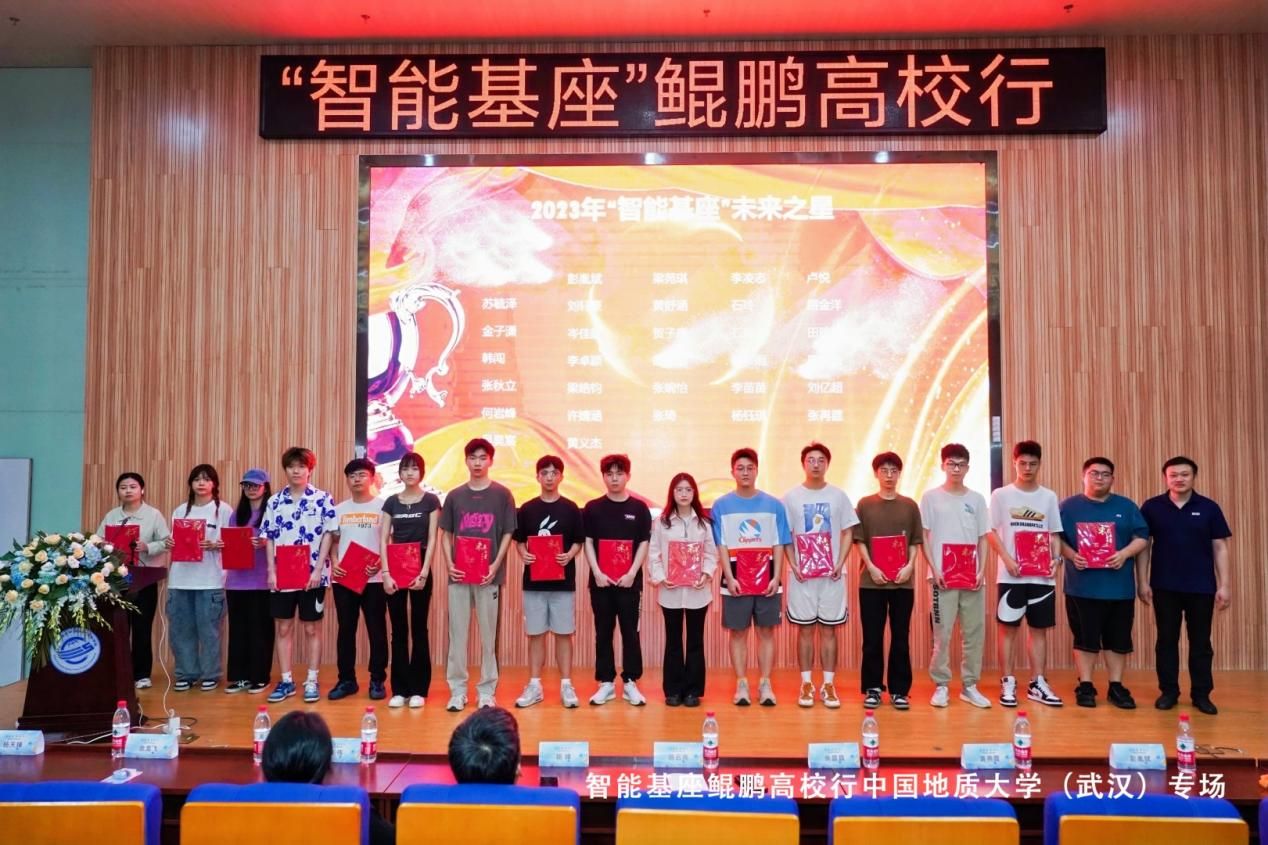 2023年学校共计32人获得智能基座奖学金,在颁奖环节中,陈院长亲自为荣获智能基座奖学金的学生们颁发智能基座“未来之星”证书。这些同学不仅在课堂上展现了卓越的学习能力,更在鲲鹏、昇腾及华为云技术相关的学习、课程建设、众智项目、社团和竞赛活动中表现突出,展现了他们的科研创新精神和技术开发能力。