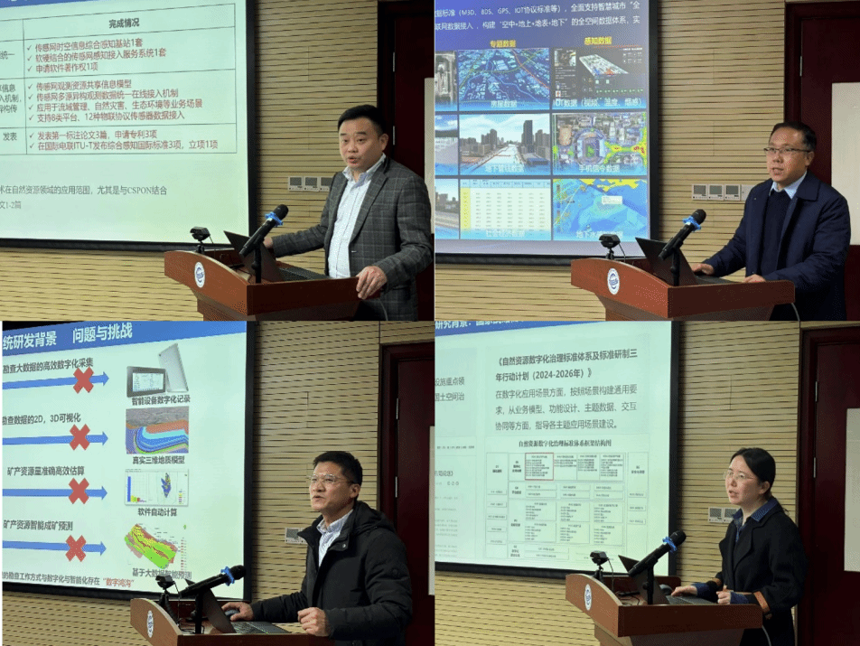 胡楚丽教授、陈占龙教授、张夏林教授、钱红勤工程师分别作了专题研究进展汇报。胡楚丽作了题为《自然资源传感网及系统应用》的专项汇报,介绍了传感网资源建模与集成管理技术、观测数据统一在线接入技术等关键技术研究进展和系统应用成果。陈占龙作了题为《自然资源管理时空信息系统平台研发及应用》的专项汇报,介绍了基于MapGIS平台的自然资源管理时空信息系统建设思路、关键技术研究进展及软件系统平台行业应用成果。张夏林作了题为《固体矿产勘查开发信息系统研发及在贵州实践》的专项汇报,从国家及行业需求出发,介绍了基于QuantyView平台的固体矿产勘查开发信息系统研发背景、总体思路和架构、系统研发成果及应用成效。罗显刚教授团队的钱红勤工程师作了题为《自然资源数字孪生工程软件研发及应用》的专项汇报,介绍了自然资源多源数据融合建模、自然资源多尺度动态建模、自然资源业务增强可视化、自然资源分布式容器化架构+中心模型库协同、自然灾害防灾减灾“四预”等关键技术研究进展,以及基于数字孪生软件平台的数字化场景建设成果。