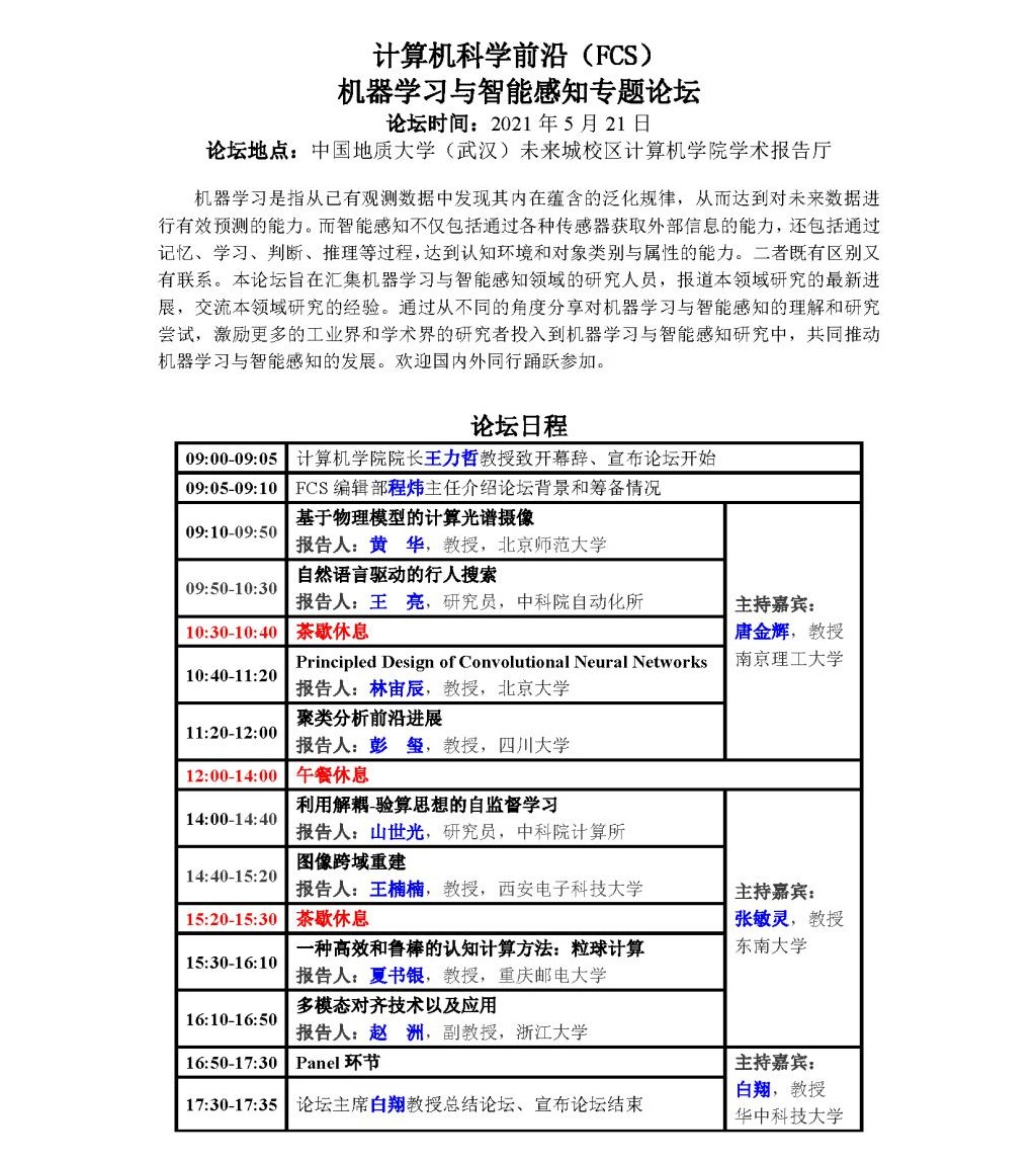 学术会议:计算机科学前沿(FCS)机器学习与智能感知专题论坛