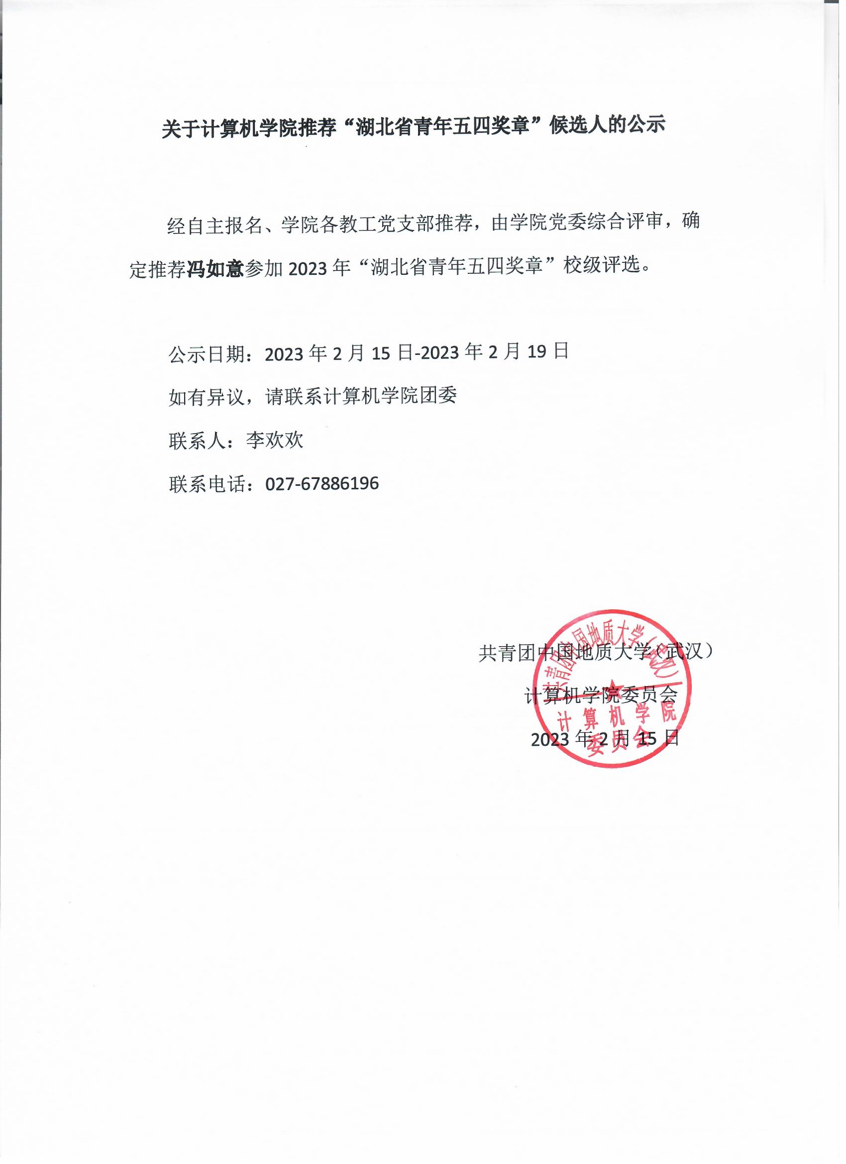 关于十大买球的正规网站推荐“湖北省青年五四奖章”候选人的公示