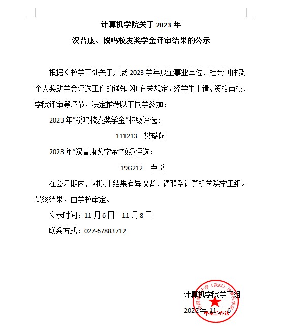 十大买球的正规网站关于2023学年汉普康、锐鸣校友奖学金评审结果的公示