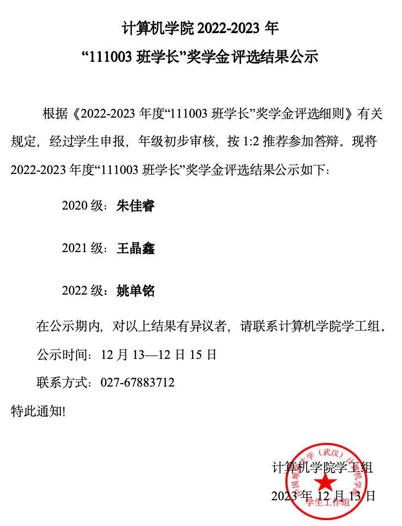 十大买球的正规网站2022-2023年 “111003班学长”奖学金评选结果公示