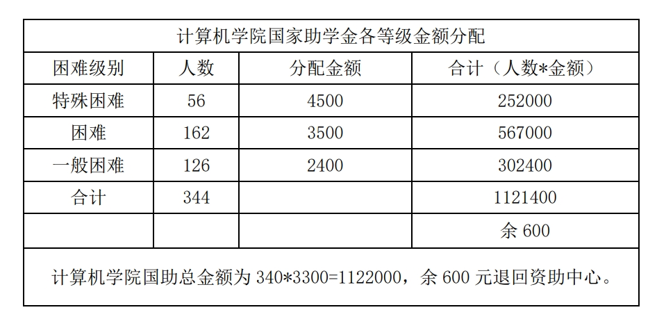 依据学校下拨困难指标数340人及金额1122000元(340*3300),学院困难学生认定实际人数为344人,其中特殊困难56人、困难162人、一般困难126人,特制定以下分配方案: