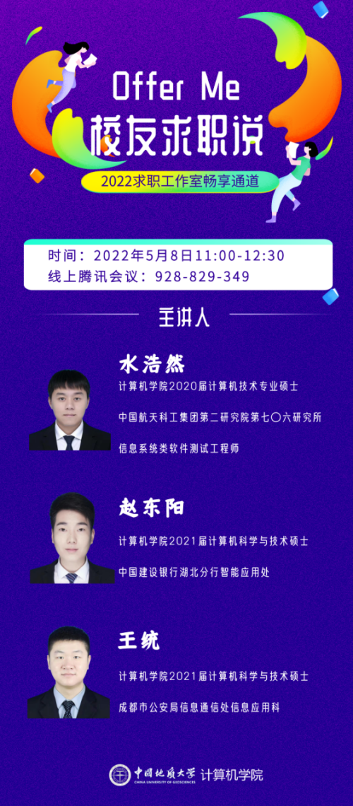 十大买球的正规网站于5月8号本周日中午11:30(腾讯会议号:928-829-349)特邀三位不同行业的校友,分享他们的职业选择、求职规划与职场感受。