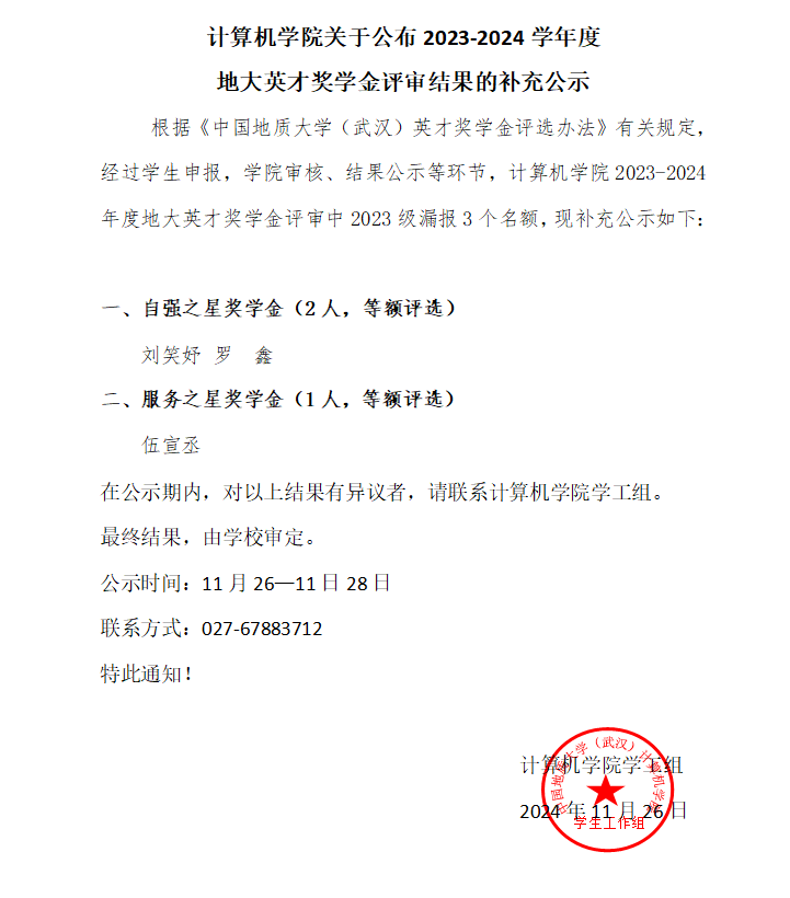 十大买球的正规网站关于公布 2023-2024 学年度地大英才奖学金评审结果的补充公示