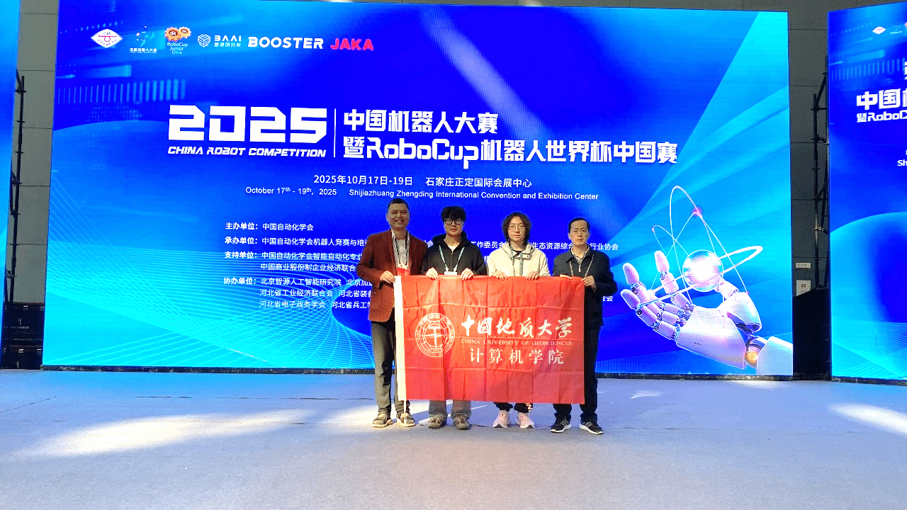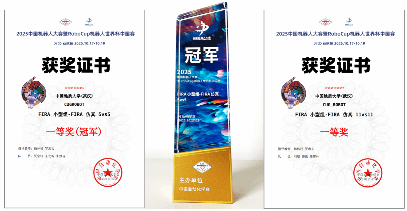 10月17日-19日,2025年中国机器人大赛暨RoboCup机器人世界杯中国赛决赛在石家庄国际会展中心浓重举行。大赛由中国自动化学会主办,河北省生态资源综合利用行业协会承办,旨在推动机器人技术前沿研究,促进产学研深度融合,为机器人和AI领域培育更多高水平创新型人才。我校CUGROBOT代表队由金牌教练杨林权老师和罗忠文老师指导,夏宇轩、王之圻、朱致远、刘培、盛梁和陈邦朴等同学组成的机器人足球代表队。经过三天的激烈竞争,我们成功卫冕了FIRA小型组-FIRA仿真5vs5赛项冠军,FIRA小型组-FIRA仿真11vs11比赛获得第四名,两项国家级一等奖。