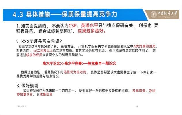 想摸清保研排名逻辑?王学海学长从综合成绩计算入手,清晰拆解学业成绩与考核成绩的权重占比,详解 CSP 成绩转换、加分项核算等关键公式,明确排名变动限制规则,让大家对保研评分体系了如指掌。