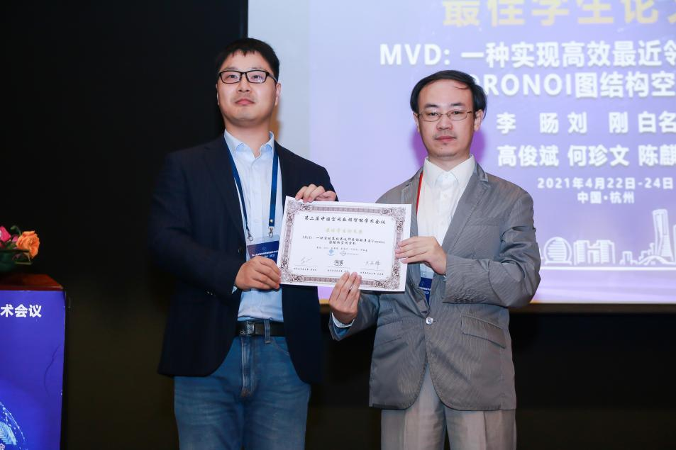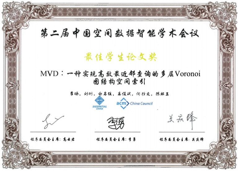 2021年4月24日,为期两天的第二届中国空间数据智能学术会议(SpatialDI 2021)在杭州市浙江宾馆圆满闭幕。以十大买球官网博士研究生李旸为第一作者,以刘刚教授为通讯作者的论文《MVD:一种实现高效最近邻查询的多层Voronoi图结构空间索引》荣获会议最佳学生论文奖。该论文针对传统树形索引主要存在的结构失衡和节点重叠问题,提出了一种基于多层Voronoi图结构的空间索引方法,提升了大规模空间数据环境下最近邻查询和k近邻查询的检索效率和I/O性能。