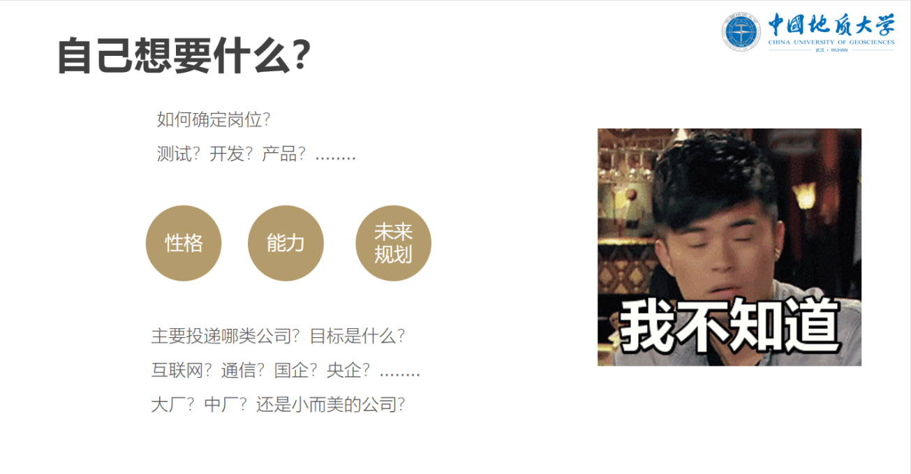 冷明辉先是告诉同学们应当从老师、家长等各个方面听取建议,并根据自身情况决定好适合自己的岗位及公司等。紧接着提醒同学们应当在做好简历、收集招聘信息等地方做好准备。最后从笔试、面试方面向同学们讲述了自己的技巧经验。