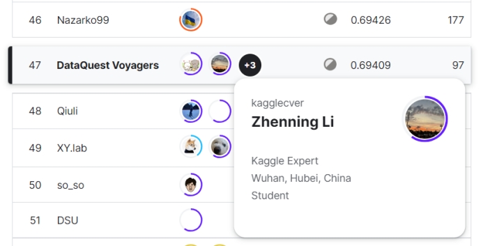 在此次的五场竞赛中,十大买球官网数据科学与大数据技术系2020级中美本科教育合作办学项目本科生李祯宁同学以及谭以宁、秦浩然、陈予贤三人组成的队伍SatoshiShimomoto发挥出色,获得佳绩。Kaggle创办于2010年,目前已经被Google收购,拥有超过80万名数据科学家用户,是全球顶级的数据科学竞赛平台,在数据科学领域享有盛名。Kaggle的使命是通过众包的方式,解决世界上最棘手的问题,同时推动机器学习和数据科学的发展。对参赛者来说,不仅是考验自己能力,更是一场实战经验。
