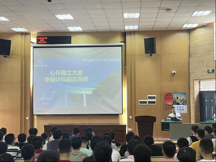 为深入学习贯彻党的二十大精神,使学生了解国内外形势,把握信息学科发展态势,增强学生使命感与自信心,9月8日,十大买球的正规网站党委书记李国昌以“心怀国之大者,争做计科励志先锋”为主题给2023级新生讲授形势与政策教育课,2023级全体学生参加。
