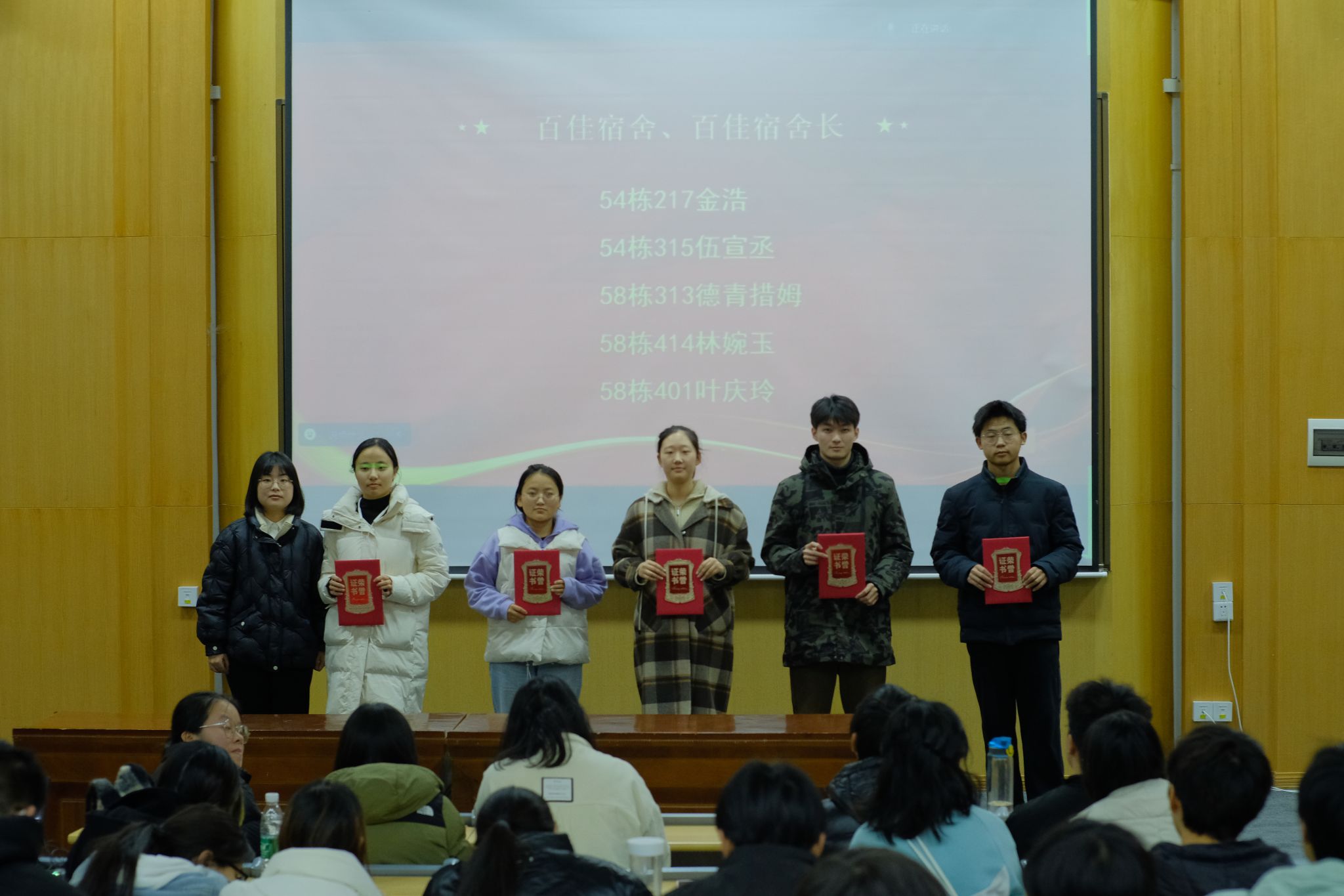 本次大会对本学期以来在宿舍文化建设、班级建设和各项工作中表现突出的同学进行表彰,这些获奖者不仅彰显了出色的集体荣誉感,也展现了个人在各方面的优异表现。希望各位同学在今后的学习生活中继续保持踏实、肯学、积极进取的态度,学会放眼未来、创新求索。