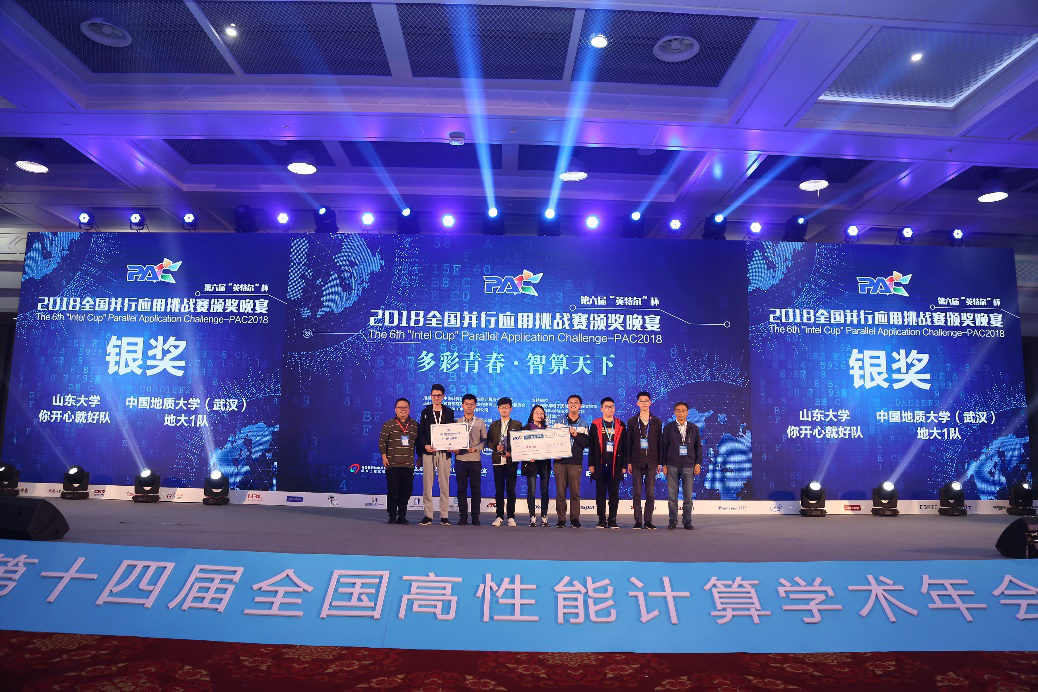 10月20日,国内两大超算赛事——第六届全国并行应用挑战赛(PAC2018)和第二届国产CPU并行应用挑战赛(CPC2018)在青岛国际会展中心落下帷幕。我校十大买球的正规网站高性能计算导师团队(王力哲、张锋、武进霞、董理君)联合指导的两支代表队,从全国四大赛区168支参赛队伍中突围进入16强决赛,与来自清华、中科大、中科院、上海交大、中山大学、山东大学、中国海洋大学、香港中文大学等单位的决赛队伍同场竞技,最终地大之光超算1队(雷辛亚、郭睿欣、马永耀、薛尔康)在PAC优化赛道中以季军的成绩获得银奖和1万元奖金;地大之光超算2队(李瑞、张晓涵、董宇、姜家伟)以全国16强的成绩分获CPC和PAC中南赛区一等奖和4千元奖金。