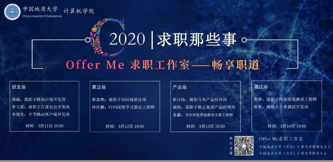 3月11日至3月14日晚,十大买球的正规网站研究生会“offer me 求职漫谈”经验分享系列活动成功举办。疫情当前,停课不停学,隔离不隔爱。活动共邀请11位学长学姐在线分享求职经验,并深入讲解和剖析求职技巧。