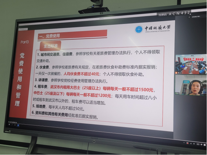 学校组织部李雨竹同志受邀讲解了学校《党费收缴、使用和管理规定》,就党费缴纳计算标准、党费交纳时间和方式、党费使用和党费管理做了详细说明,并解答了大家提出的问题。