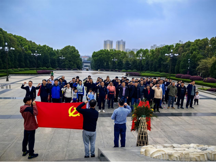 最后,全院教工党员前往黄麻起义和鄂豫皖苏区革命烈士纪念园,整齐列队,向革命烈士敬献花篮、三鞠躬致敬。鲜红的党旗前,全体党员举起右拳,在纪念碑下,面对党旗,在李国昌书记的带领下,重温了入党誓词:“我志愿加入中国共产党……随时准备为党和人民牺牲一切,永不叛党”。