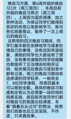 他指导班级制定了每堂课班级考勤制度和每周三次集体晚自习制度。在课堂督促学,在课余时间集体学。
