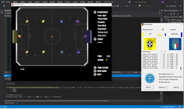 刘志鑫同学回忆道:仿真组的比赛有一套已有的代码框架和编写要求,通过编写指定的接口来实现特定的策略,各个算法相互协作来使各个仿真机器人相互协作,完成比赛。为了快速入手这个框架,尽早地开展算法编写,杨老师在正式比赛开始就邀请我们小组的成员召开了一次视频会议,讲解了基本的比赛规则和代码的基础框架,同时解答了我们的疑惑。并根据每个人的兴趣安排了初期的工作,让我们根据自己的想法去进行代码的开发,进行测试与实验。之后我们就根据指导书和杨老师的讲解,很快就配置好了代码框架,开始进行算法的编写。