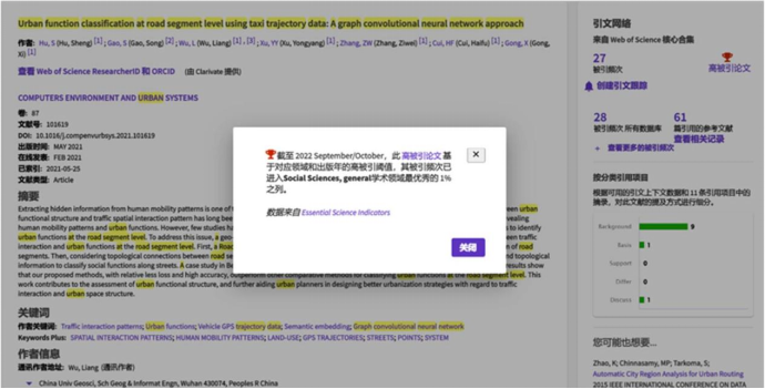 根据2022年10月基本科学指标数据库(Essential Science Indicators,简称ESI)最新数据显示,十大买球的正规网站全空间地理大数据智能处理与GIS基础平台研究中心团队在国际城市研究主流期刊Computers, Environment and Urban Systems(简称CEUS)上发表的学术论文“Urban function classification at road segment level using taxi trajectory data: A graph convolutional neural network approach”入选ESI高被引论文(Highly Cited Paper)。该论文第一作者为团队的博士生胡胜,通讯作者为吴亮教授。CEUS为国际顶级计算城市学和地理信息科学的重要刊物,期刊以计算机科学为背景,聚焦城市规划、交通、能源、环境、社会学和经济等学科融合的新兴领域,刊发城市计算、大数据和城市系统等方向的最新研究。当前CEUS的影响因子为6.454,为T1期刊。