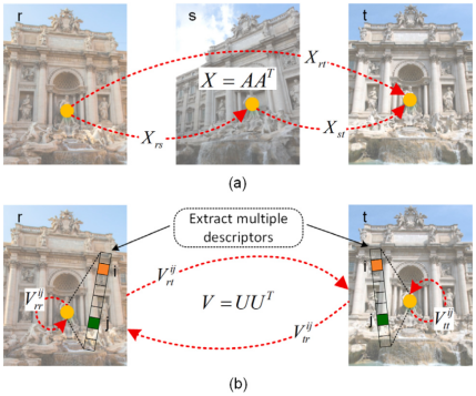 本文研究人员发现,传统手工描述符和基于学习的描述符在不同的场景,甚至在同一图像的不同图像块中都表现出了很大的差异,这种鲁棒性的缺乏源于单一描述符的次优设计——即很难实现对所有种类的不确定性因素的不变性。因此,受到多图匹配中循环一致性约束的启发,本文从多特征融合角度出发,将其扩展为多特征-多图循环一致性模型,利用谱松弛和快速矩阵近似分解技术进行求解。在多个公开数据集上的结果表明,本文提出的方法不仅在关键点匹配质量上有显著改善,而且在图像映射估计、相机姿态定位等下游应用上也取得了比同期方法更好的效果。